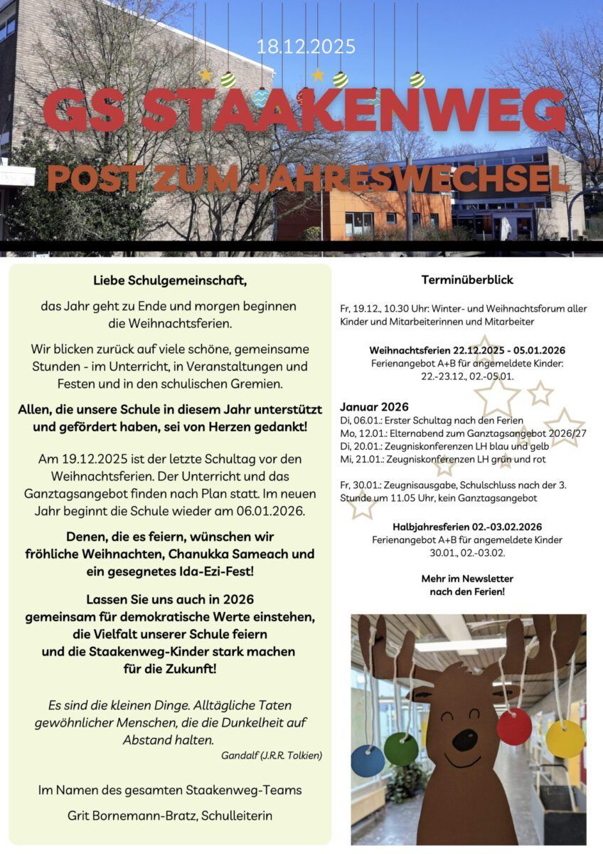 Morgen findet der letzte Schultag vor den Weihnachtsferien statt. Per Mail gab es heute von unserer Schulleiterin Frau Bornemann-Bratz noch „Post zum Jahreswechsel“. Diese finden Sie wie immer auch auf der Homepage im Bereich Eltern/Elternbriefe.